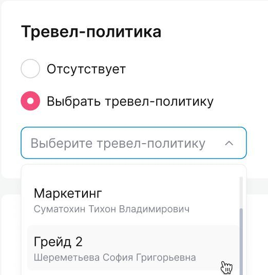 Для назначения тревел-политики переместите указатель в поле «Выбрать тревел-политику» и выберите подходящую из выпадающего списка.