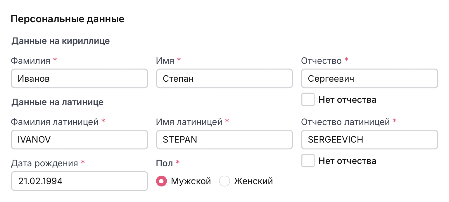 Введите ФИО на кириллице, как в паспорте РФ или в свидетельстве о рождении. Система автоматически транслитерирует его на латиницу.