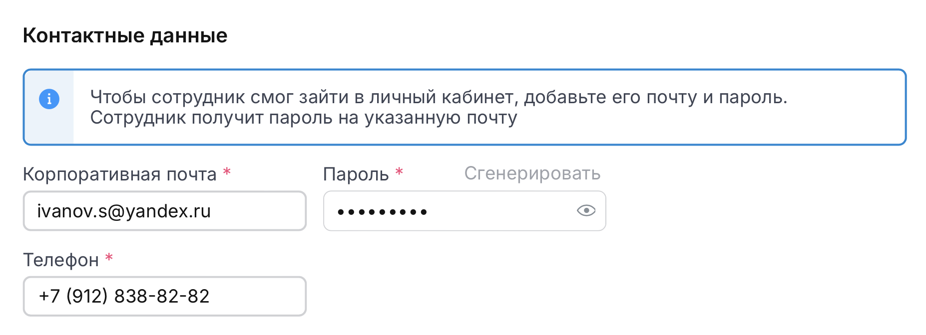 Введите e-mail и номер телефона сотрудника. Придумайте пароль.