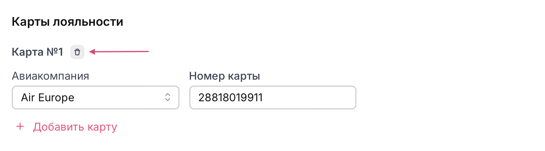 В случае, если необходимо удалить карту лояльности, воспользуйтесь кнопкой корзины.