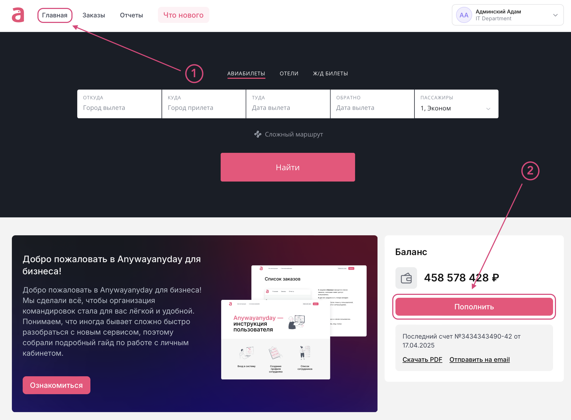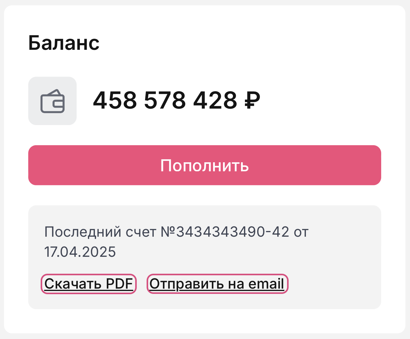 При необходимости можно повторно выгрузить последний счет или отправить его на электронную почту. Для этого воспользуйтесь кнопками "Скачать PDF" и "Отправить на email" соответственно.