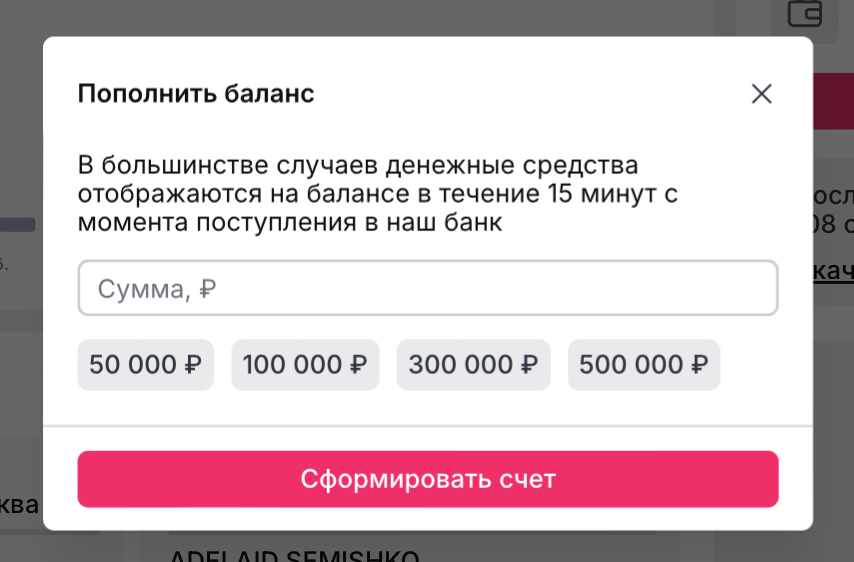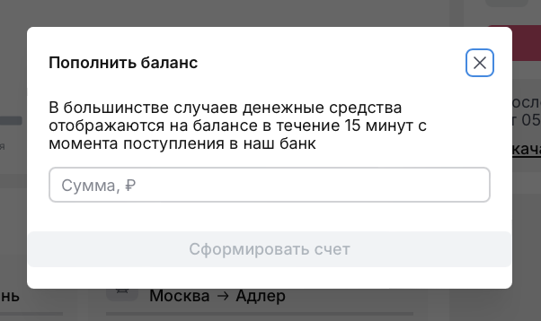 Для того чтобы сформировать счет c QR-кодом, зайдите на главную страницу и в окне с балансом нажмите кнопку "Пополнить".