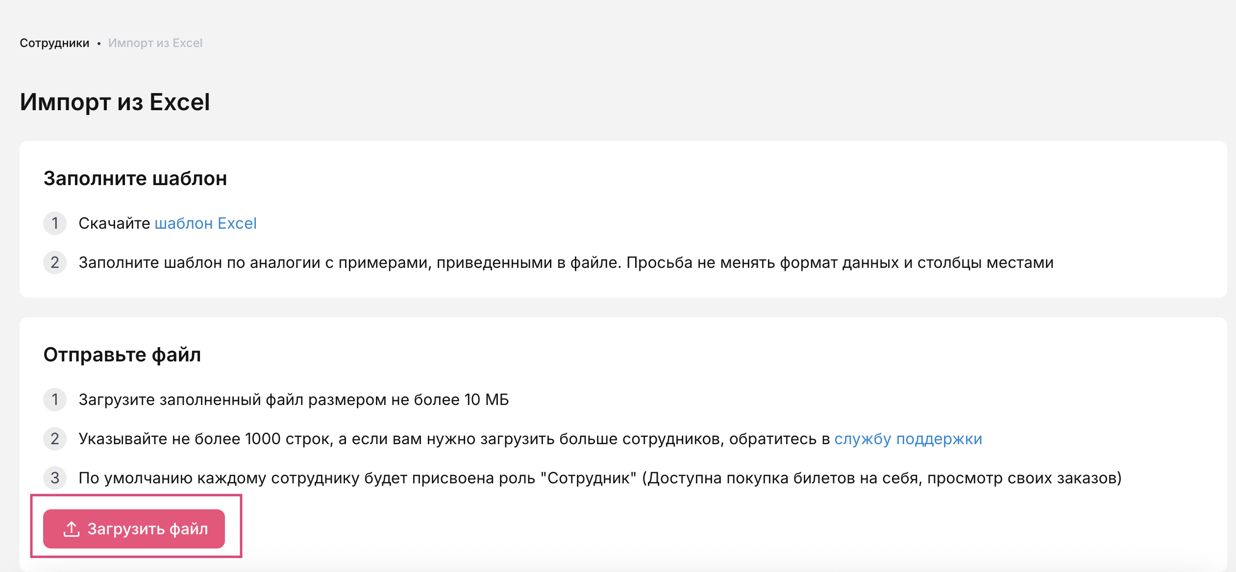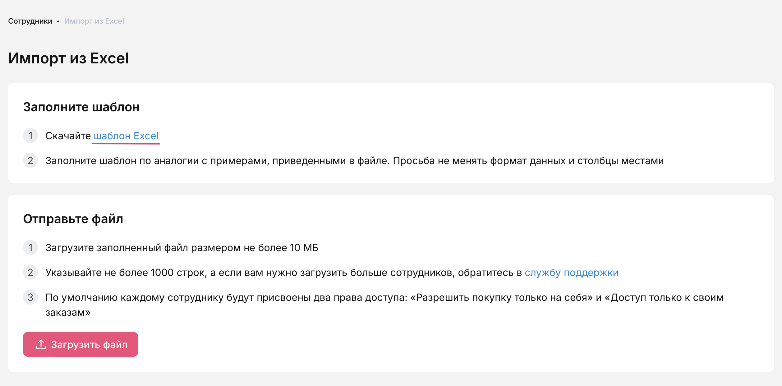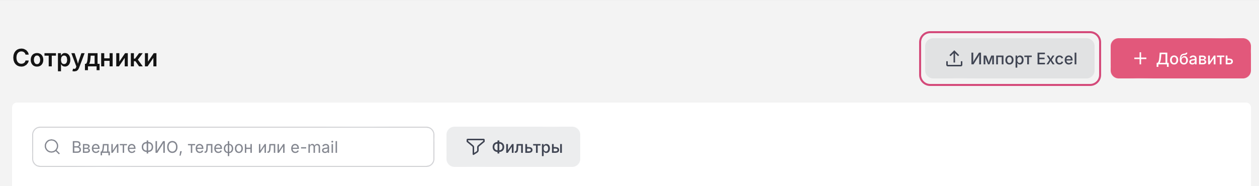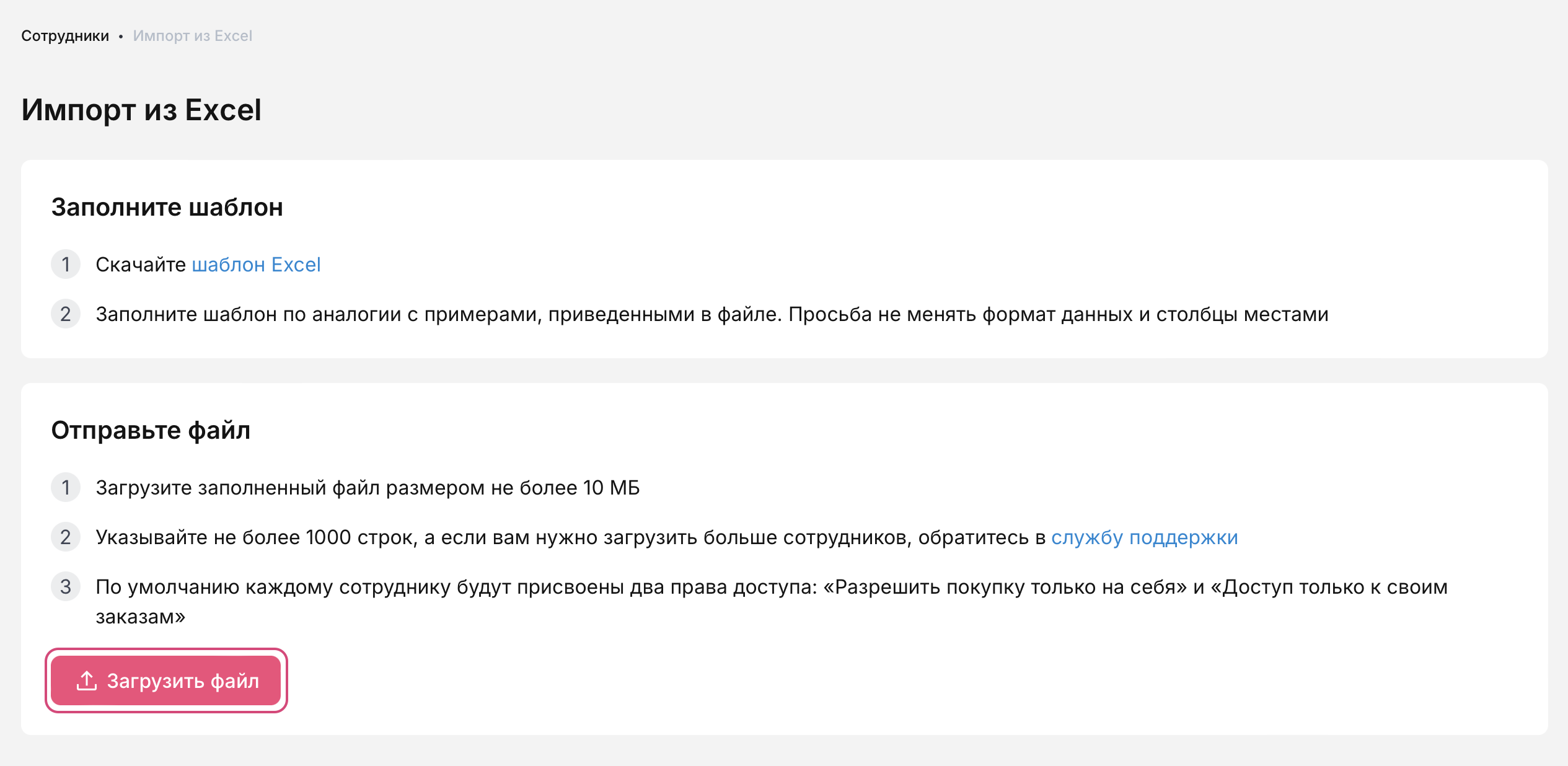 Вернитесь в раздел «Сотрудники» и нажмите кнопку «Загрузить файл». Выберите заполненный файл и подтвердите его загрузку.