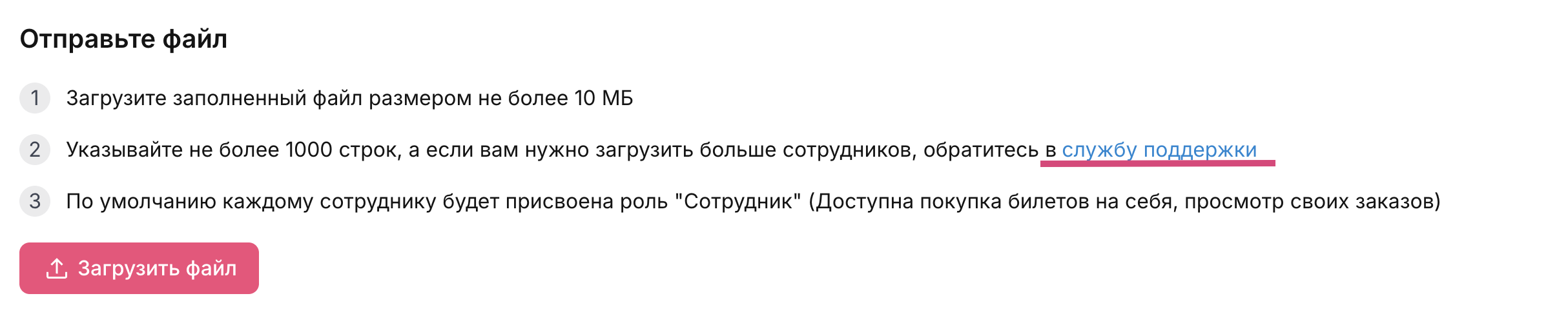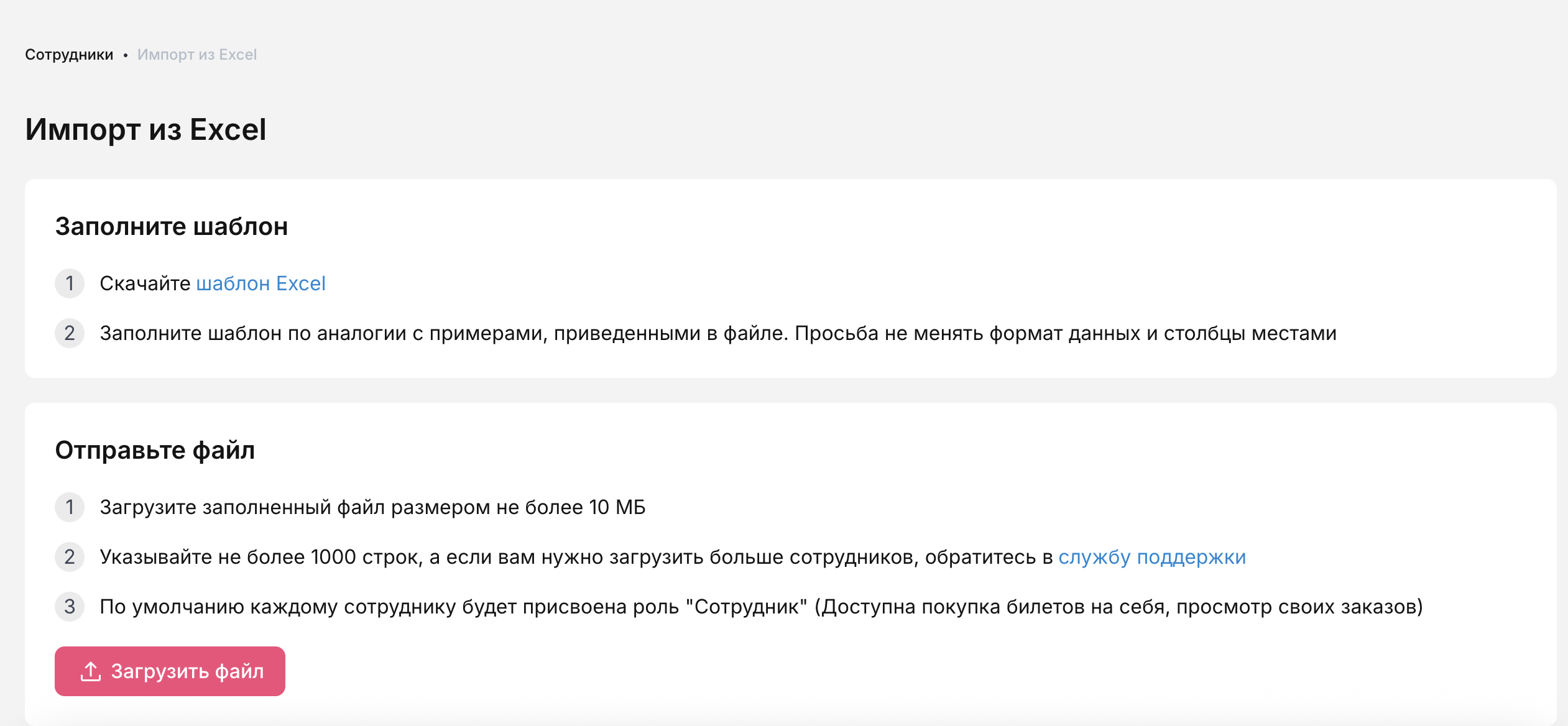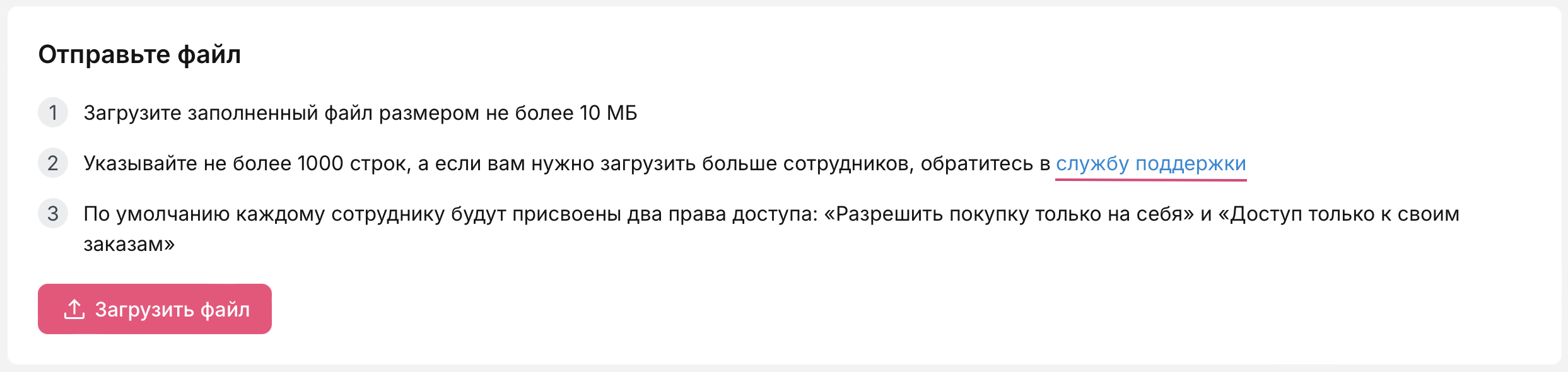 Вернитесь в раздел «Сотрудники» и нажмите кнопку «Загрузить файл». Выберите заполненный файл и подтвердите его загрузку.