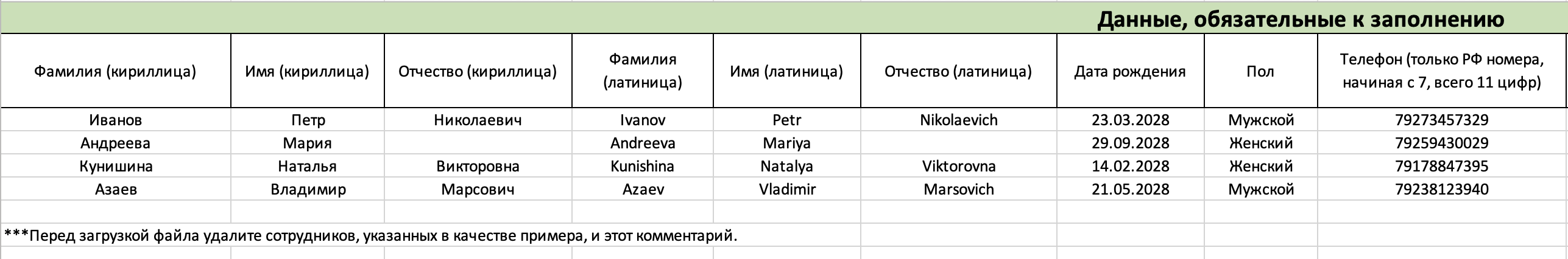 Перед загрузкой файла удалите сотрудников, которые добавлены в качестве примера.