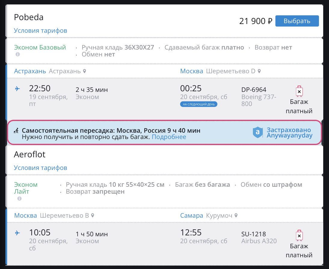 Маршруты с такими пересадками выделены знаком "Застраховано Anywayanyday"