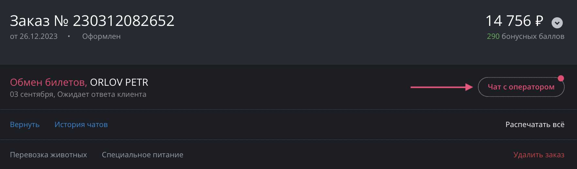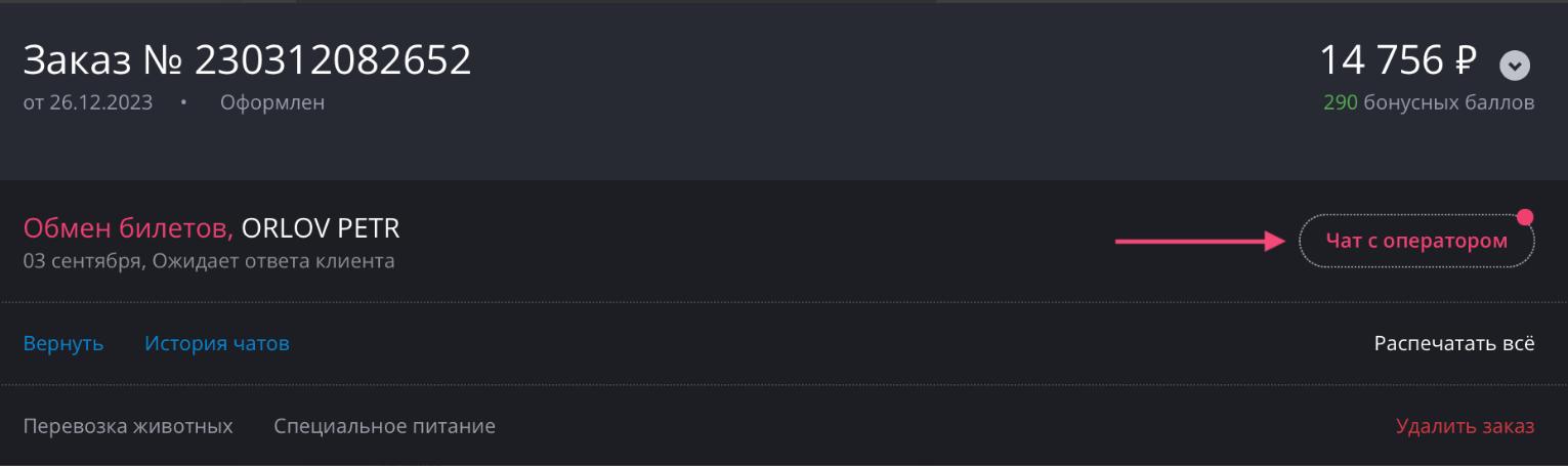Перейдите в раздел «Заказы» и найдите билет, который хотите вернуть. Откройте его, нажав на номер заказа.
