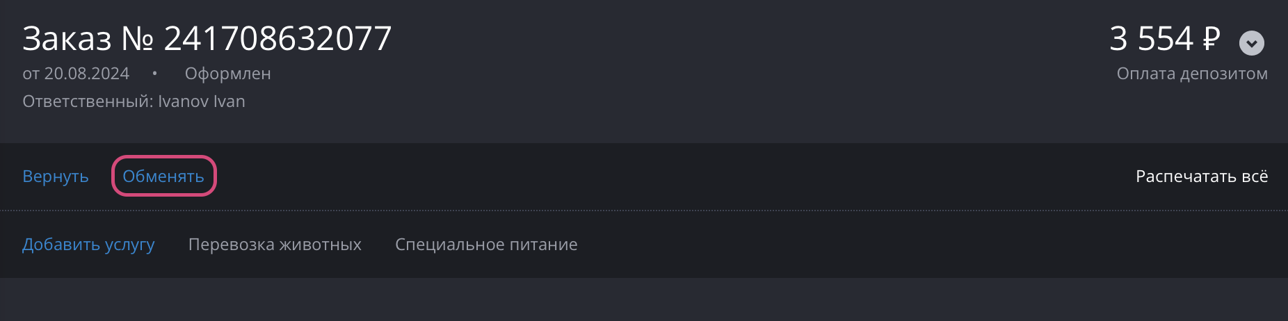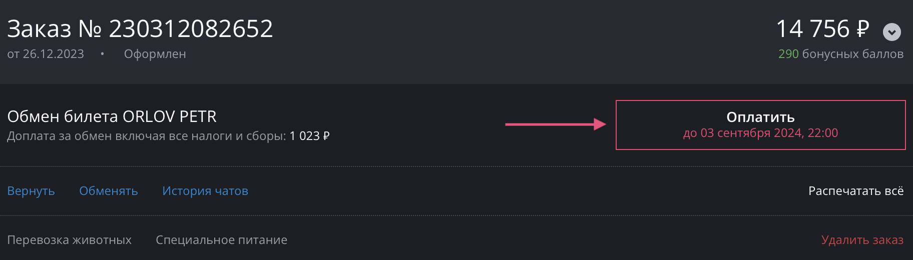 Откройте раздел «Заказы», выберите нужный билет и нажмите «Обменять».
