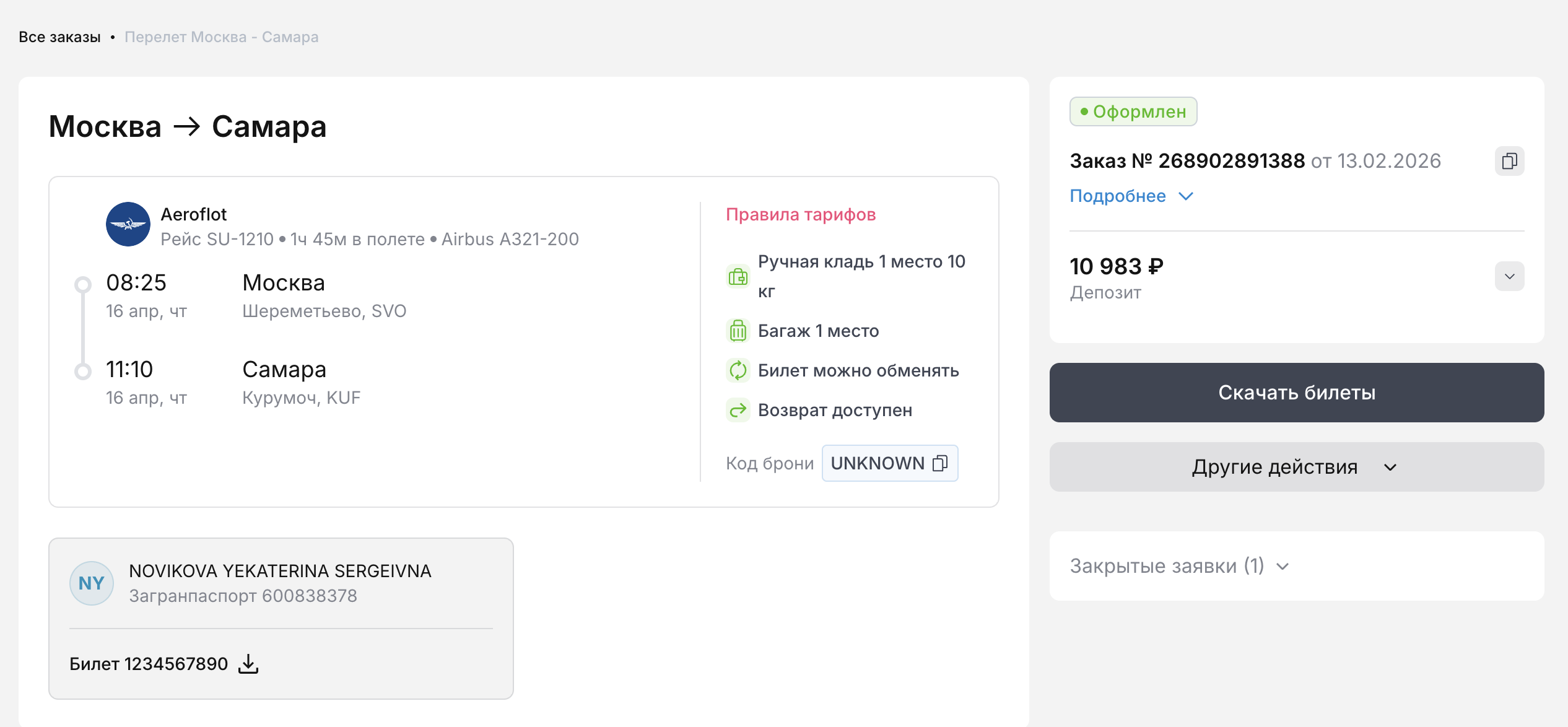 Перейдите в раздел «Заказы», найдите и откройте билет, который хотите вернуть.