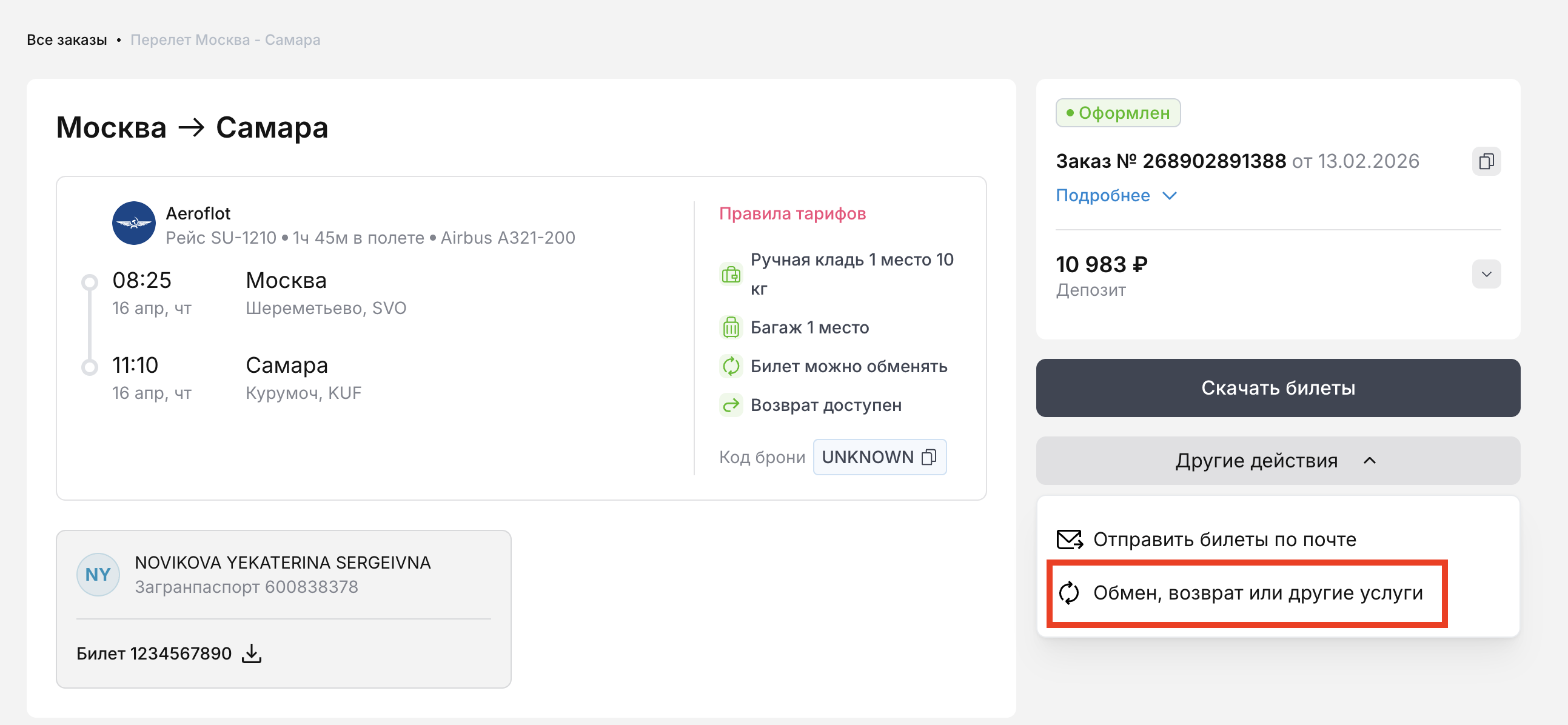 Выберите "Другие действия" - "Обмен, возврат или другие услуги".