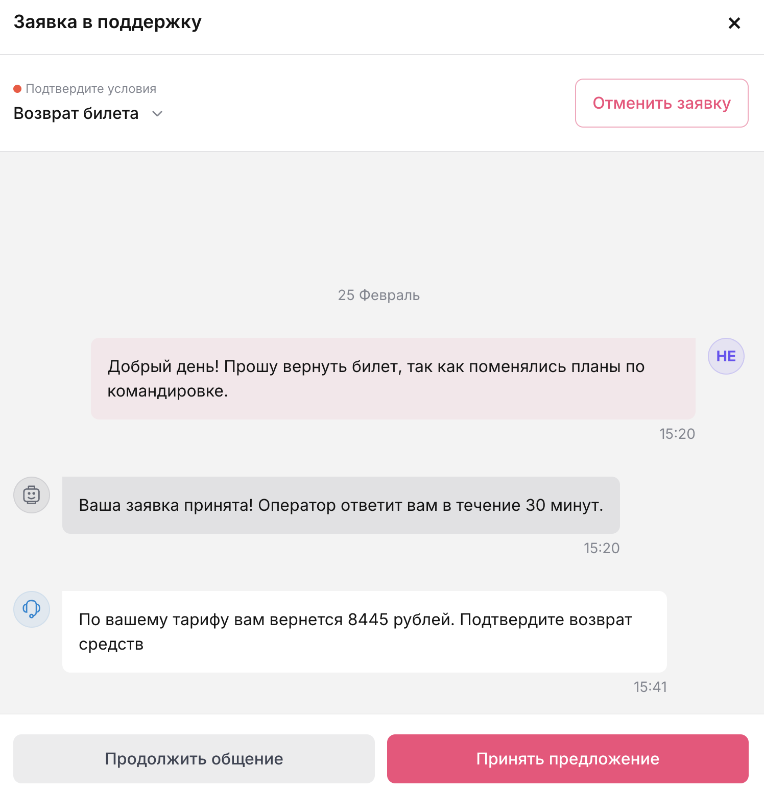 После обработки запроса, оператор пришлет предложение с суммой возврата в чат.