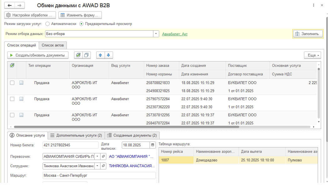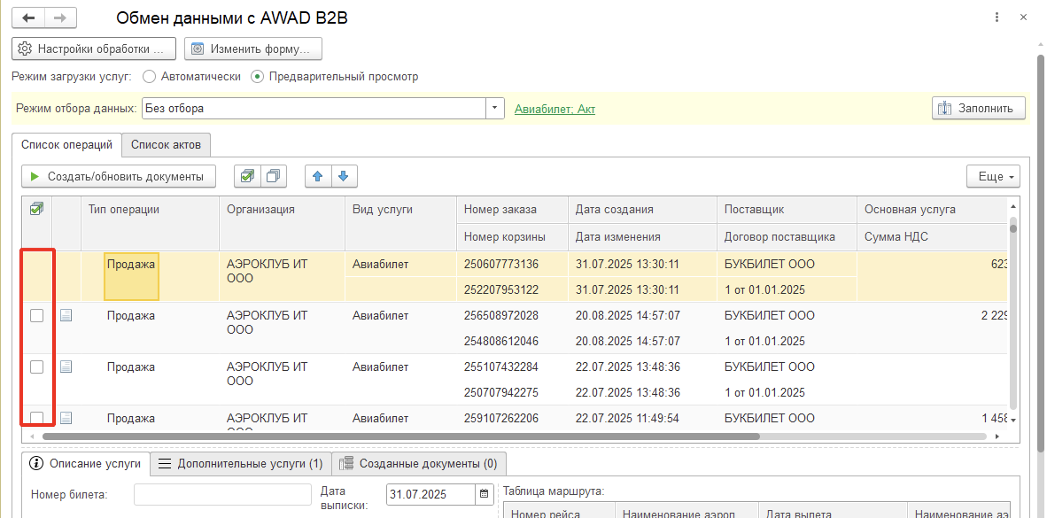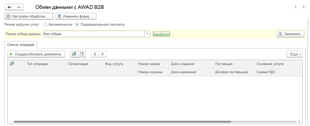 После загрузки табличная часть заполняется билетами, которые располагаются на сайте AWAD B2B. В ней можно увидеть Организацию, Вид услуги, Тип операции, Номер заказа, Номер корзины, Дата создания, Дата изменения, Поставщик, Договор поставщика, Основная услуга, Сумма НДС, Сумма, Сотрудник, Режим загрузки данных и Статус загрузки. Самая левая колонка в табличной части это признак загрузки билета, флаг можно проставить только, если мы получили все необходимые данные. Например, если у нас режим загрузки Поступление и выдача денежных документов и нет информации о Сотруднике установить Признак загрузки будет нельзя.