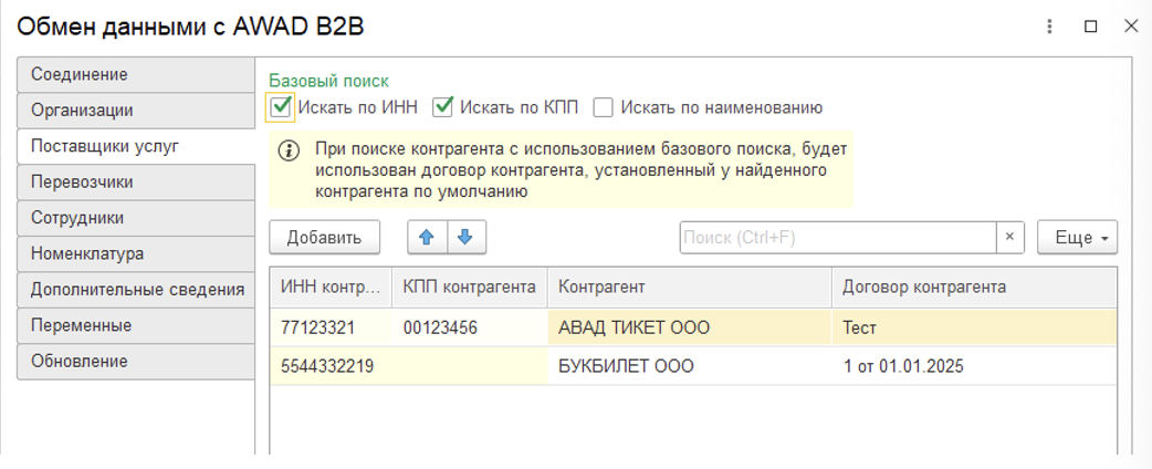 Базовый поиск – настройка базовых параметров для поиска поставщика услуг. Доступны варианты Искать по ИНН, Искать по КПП и Искать по наименованию. Базовый поиск может осуществлятся по нескольким параметрам одновременно, при этом использоваться будет договор контрагента, установленный по умолчанию. Если у контрагента нет договора по умолчанию и в таблице исключений нет полученного сочетания ИНН/КПП, то при загрузке мы получим ошибку заполнения.