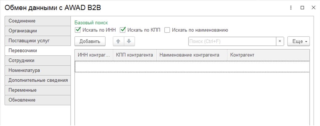 Базовый поиск – настройка базовых параметров для поиска перевозчика. Доступны варианты Искать по ИНН, Искать по КПП и Искать по наименованию. Базовый поиск может осуществляться по нескольким параметрам одновременно.