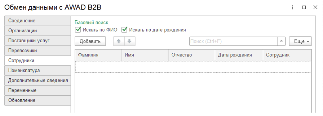Базовый поиск – настройка базовых параметров для поиска сотрудника. Доступны варианты Искать по ФИО и Искать по дате рождения. Базовый поиск может осуществлятся по нескольким параметрам одновременно.