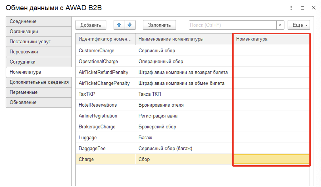 Настройка неосновных дополнителдьных услуг. В основном нужна для загрузки Поступлений (акты, накладные, УПД) (гостиницы, сервисный сбор и т.д.). Включает в себя настройки: