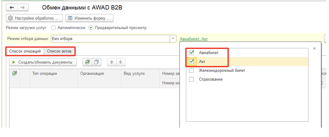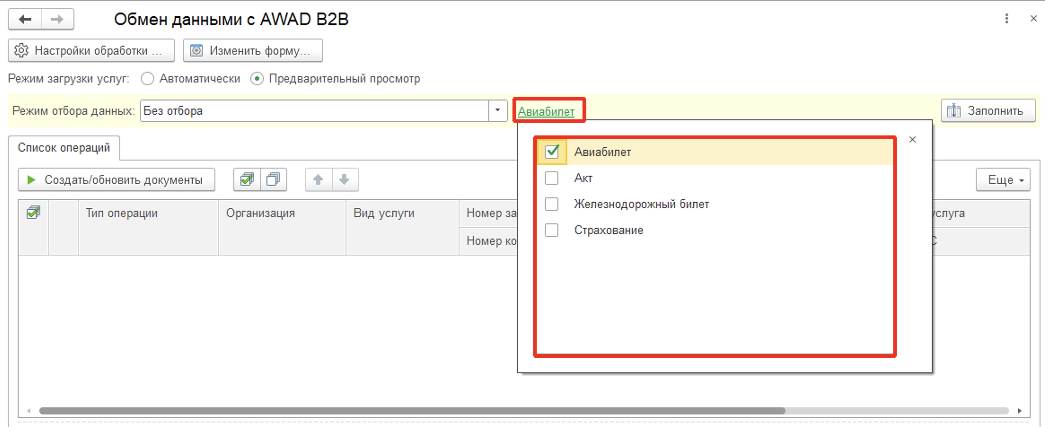 Также можно выбрать какие виды услуг мы будем грузить, можно выбрать несколько вариантов. Если в настройках указано, что какой-либо вид услуг не загружаем, но перед заполнением табличной части мы можем все равно выбрать этот вид услуг в отборе для отображения, но загрузить их без ручного изменения Режима загрузки услуг построчно в самой табличкой части или в Настройках сразу для всех строк будет нельзя.