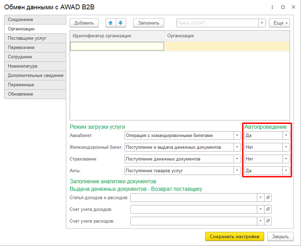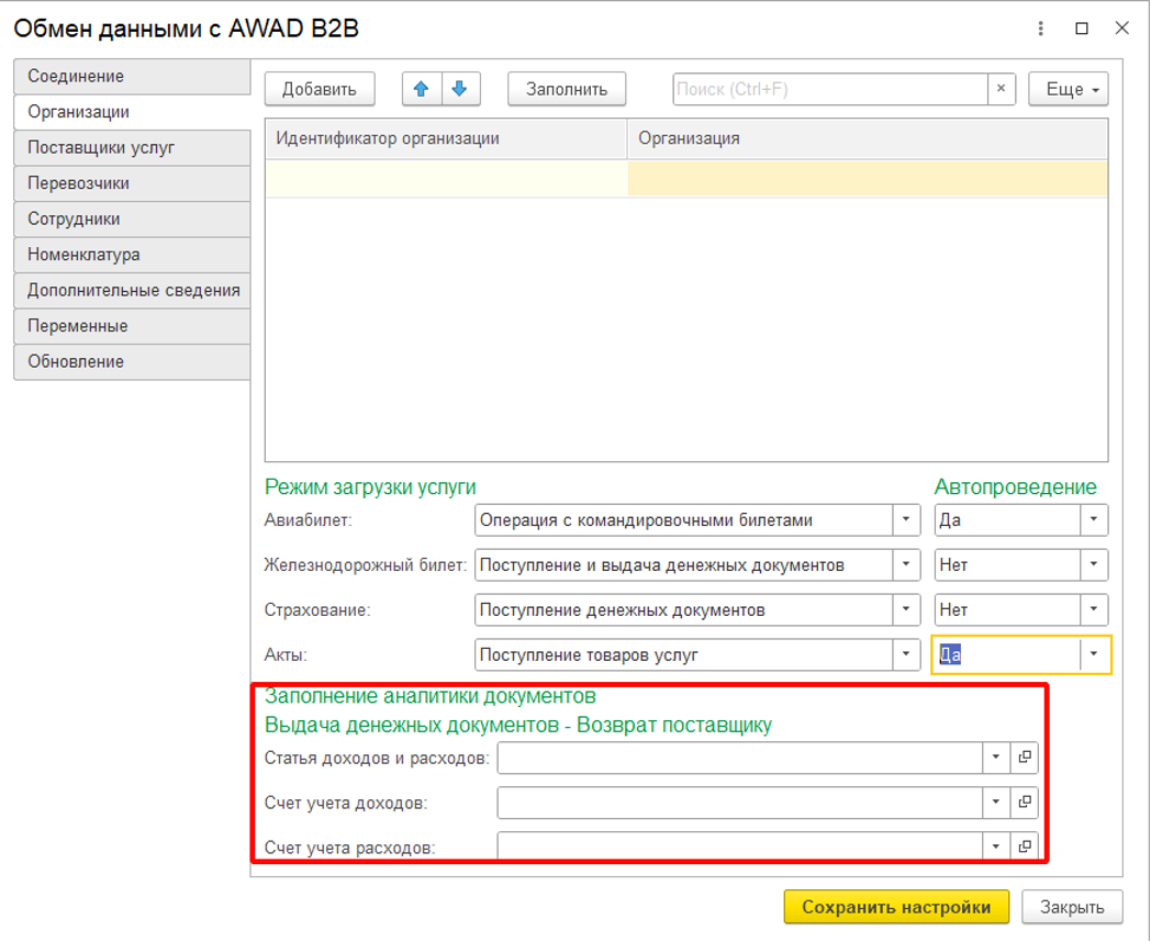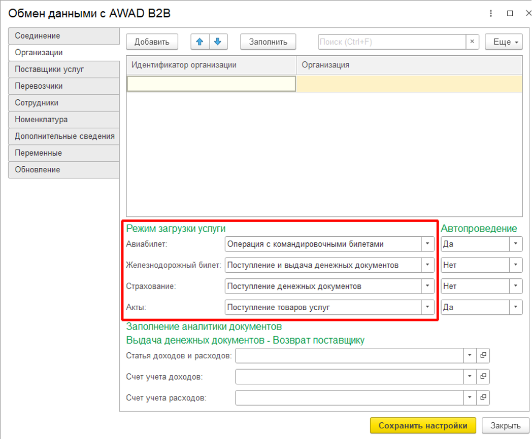 Настройка списка организаций с указанием настройки загрузки услуг по каждой организации. Включает в себя настройки: