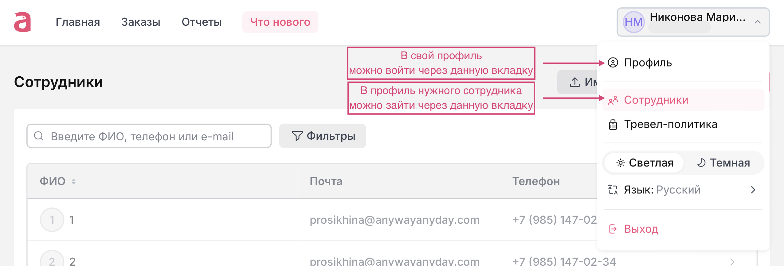 Шаг 1 Зайдите в профиль нужного сотрудника.