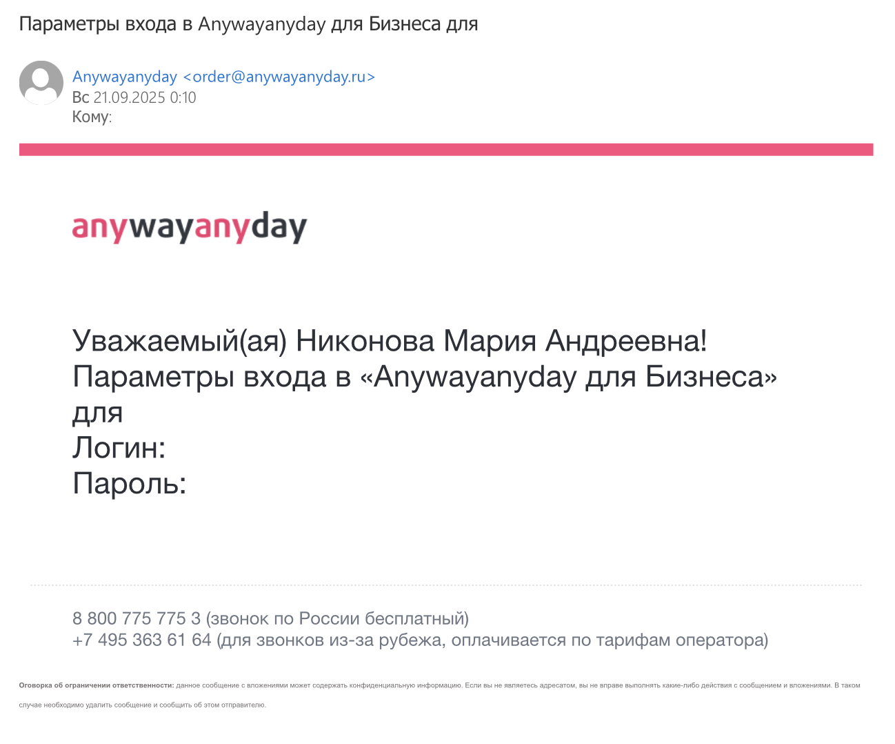 После успешного сохранения сотруднику, на почту, указанную в его профиле, придет письмо с логином и новым паролем.