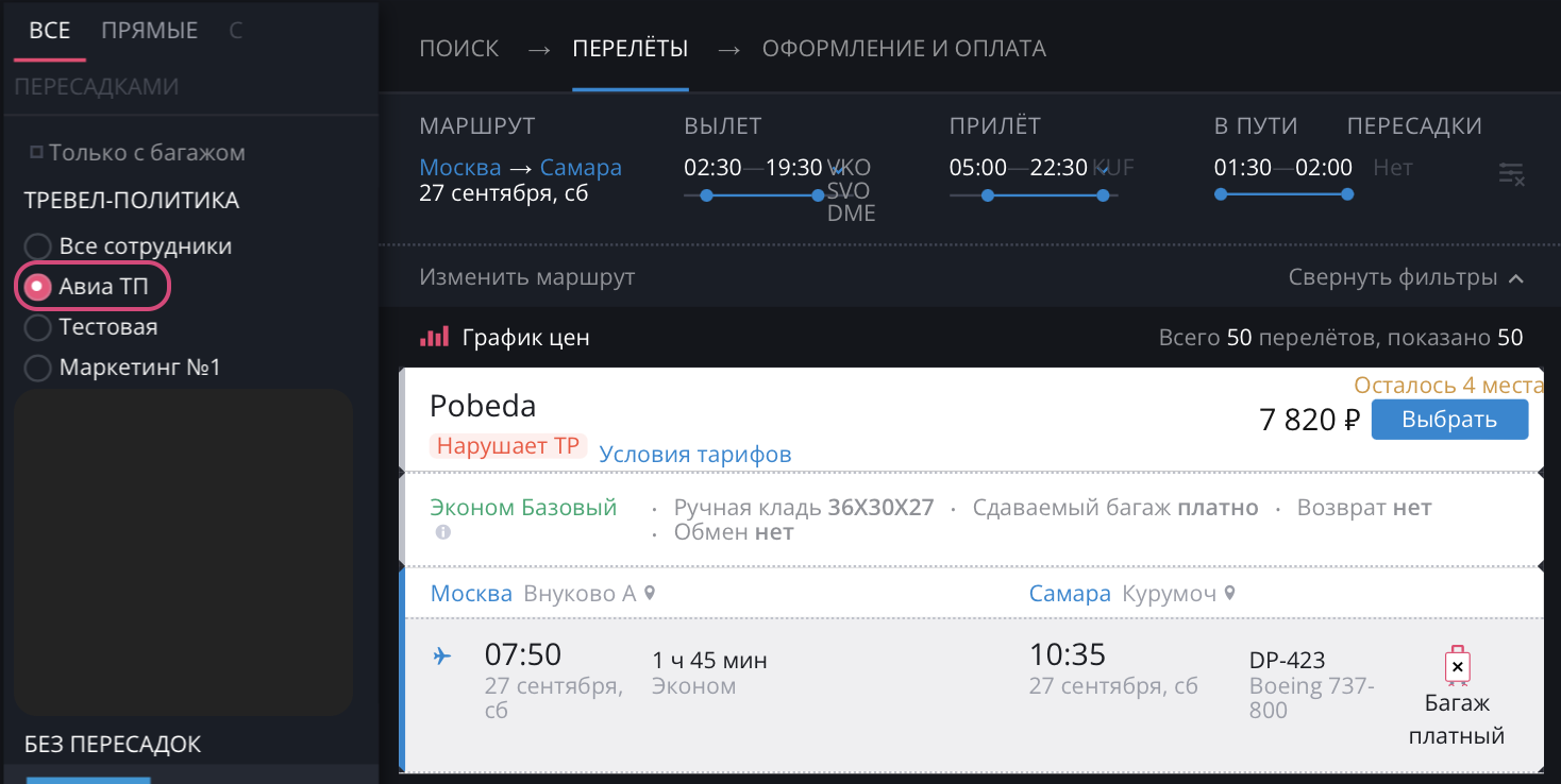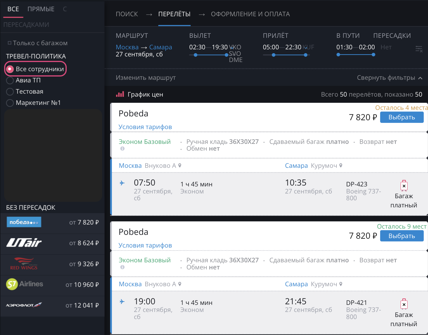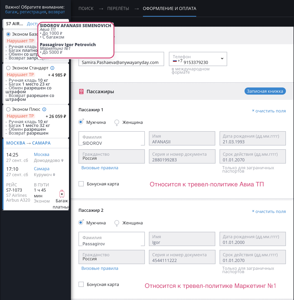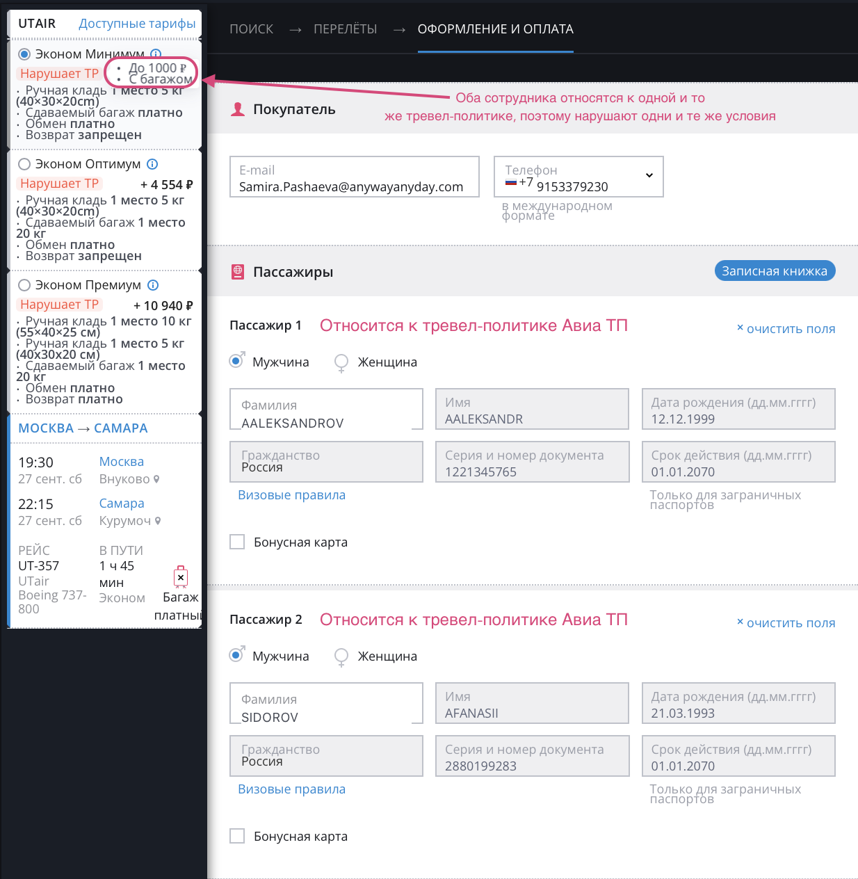 Оформление авиа заказа на сотрудников из разных тревел-политик