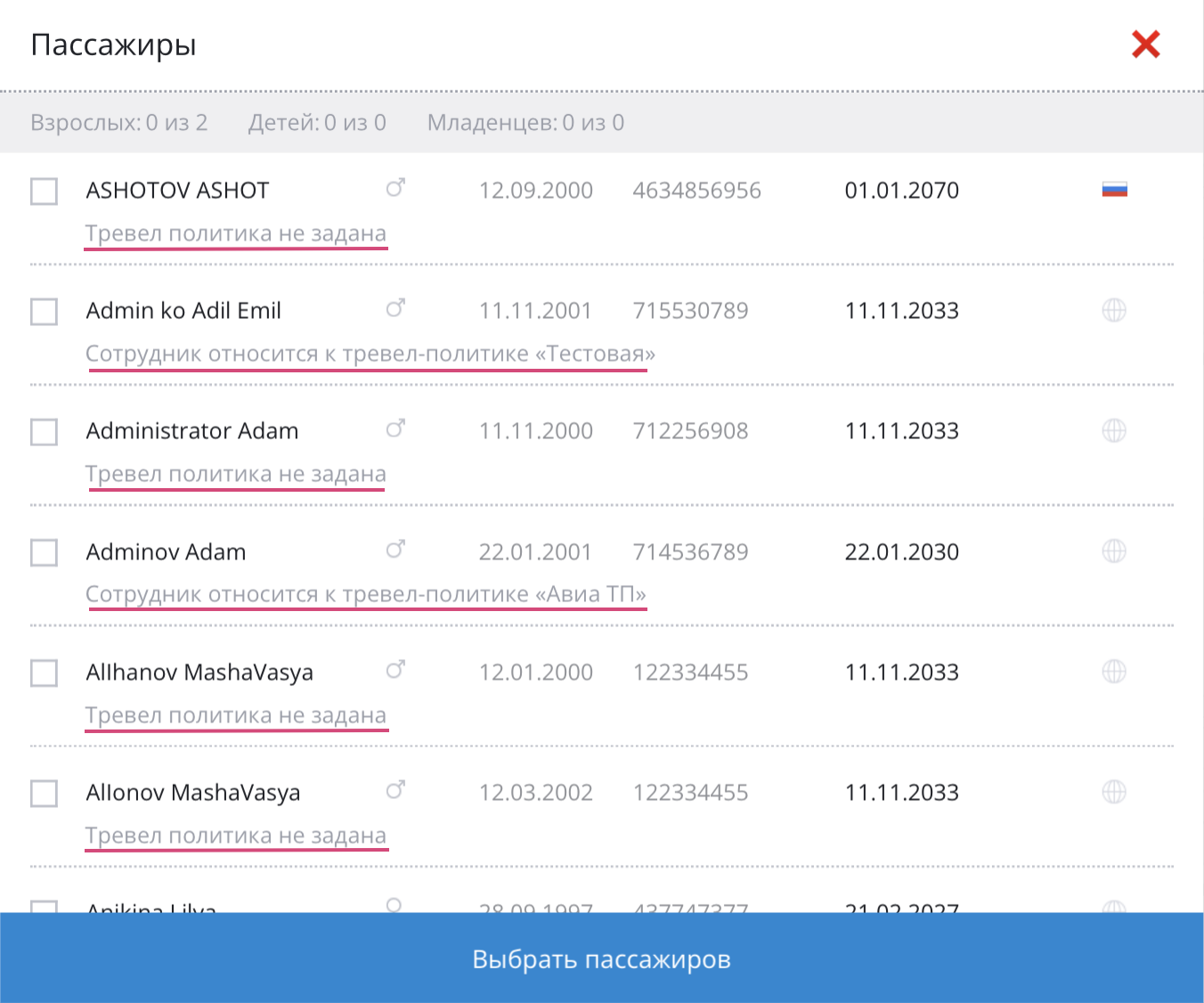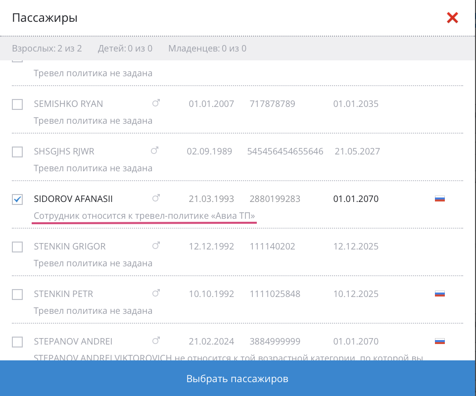 2. Из записной книжки можно выбрать только сотрудников, относящихся к тревел-политике, выбранной на странице с перелетами.