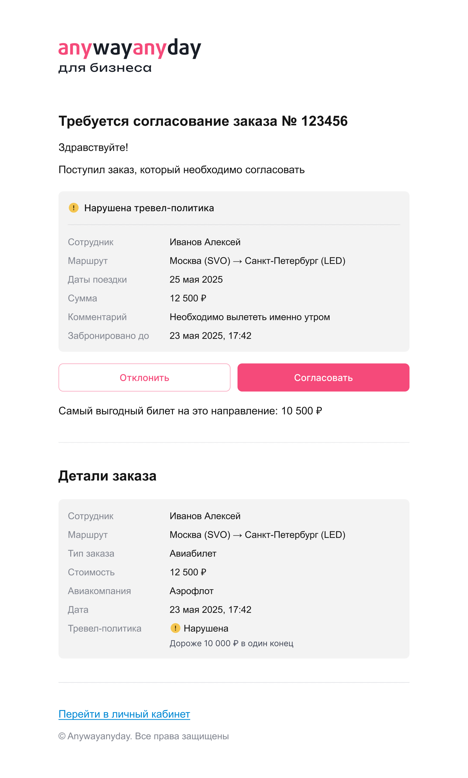 💡 Рекомендация: цены на билеты и отели меняются динамически. Чем дольше заказ ожидает решения, тем выше риск подорожания. Чтобы избежать лишних расходов компании и повторных согласований, принимайте решение как можно быстрее.