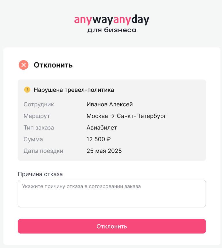 Если вы считаете, что нарушение тревел-политики неоправданно, нажмите «Отклонить».